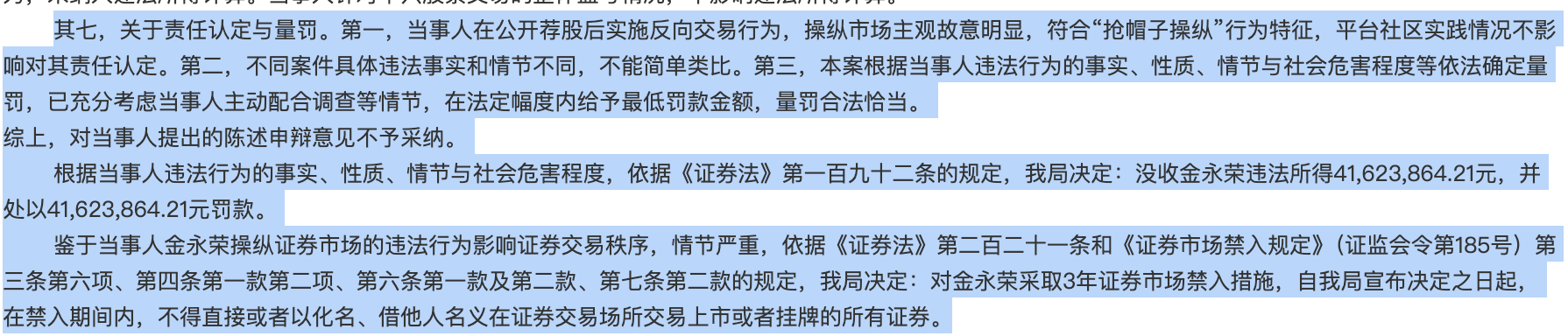 面对监管调查,金永荣及其代理人曾提出七点申辩意见,核心聚焦于自身是否具备市场影响力、行为是否构成操纵、发帖是否属于荐股等关键问题,并请求减轻或免除处罚。