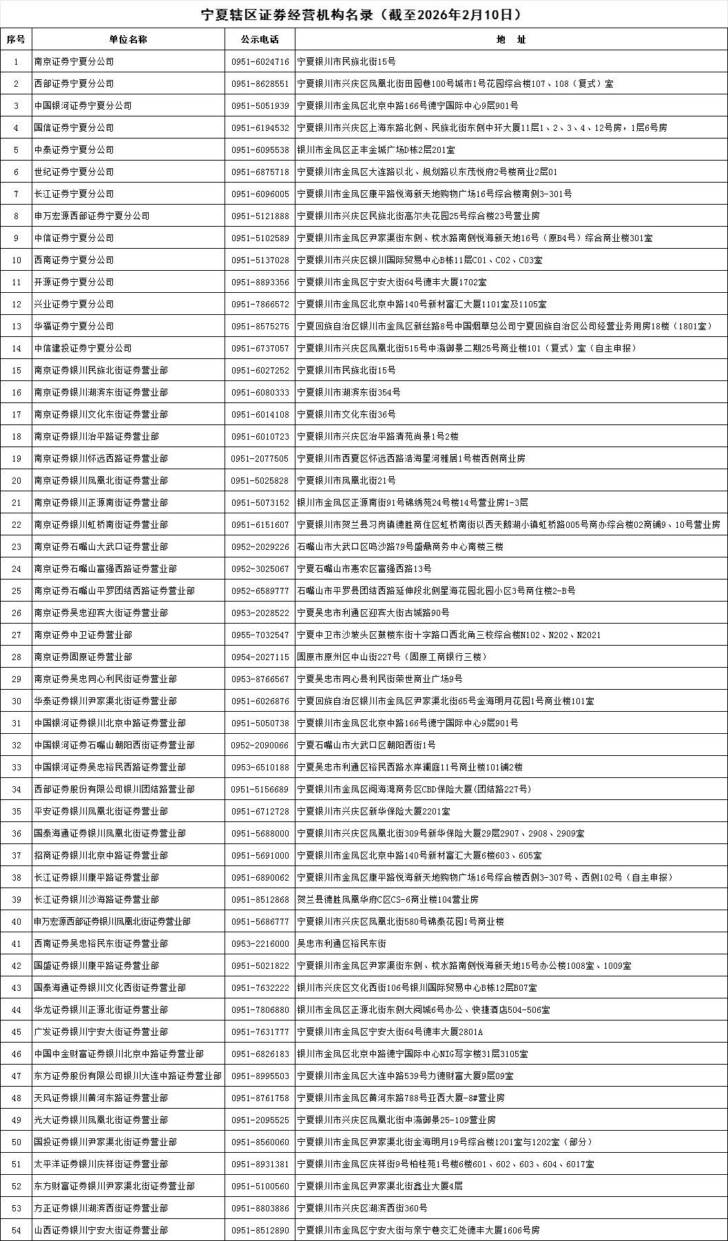 宁夏辖区证券经营机构名录(截至2026年2月10日)